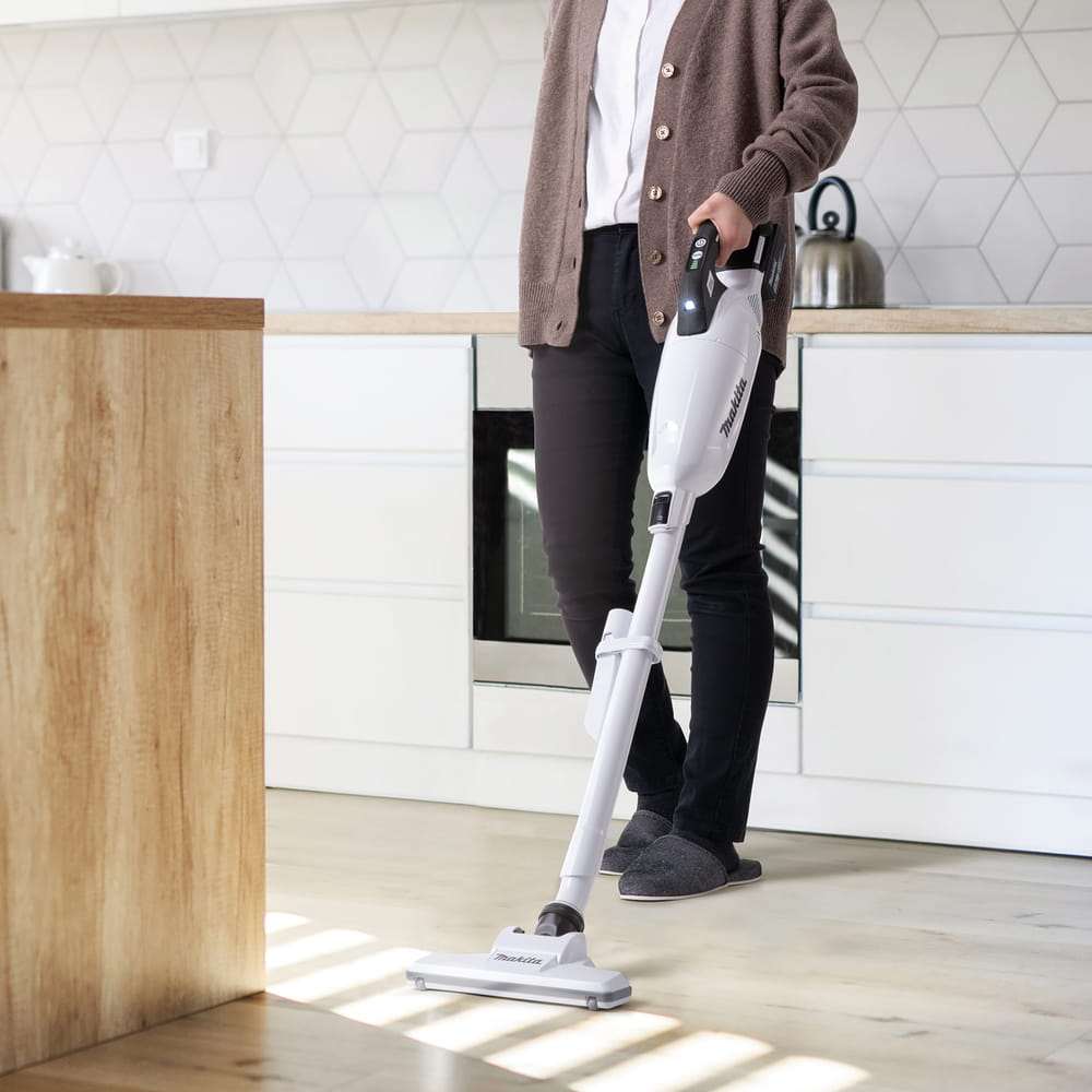 Makita DCL284FZW to pionowy odkurzacz z silnikiem bezszczotkowym 18V, który oferuje wysoką moc zasysania przy niższym poziomie hałasu. Posiada bezworkowy system czyszczenia, diodę LED do oświetlenia obszaru roboczego oraz cztery biegi do wyboru siły ssania. Ergonomiczny, miękki uchwyt i zabezpieczenia przed przypadkowym wysunięciem rury zapewniają komfort i bezpieczeństwo użytkowania.